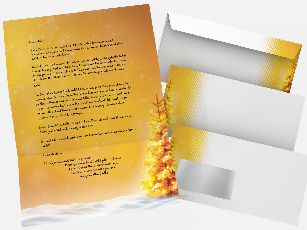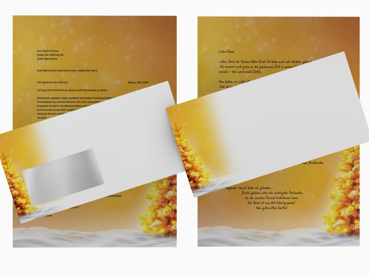 Send your holiday greetings in style with the exclusive Christmas stationery set “Radiant Christmas Tree” from paperandpicture.de. Featuring a shining golden tree on a snowy background, this design is perfect for personal greetings, business correspondence, or festive invitations.